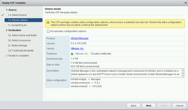 The next window will provide some details to be reviewed. As shown in the screenshot, if there are “extra configurable options,” VMware will prompt the following text: