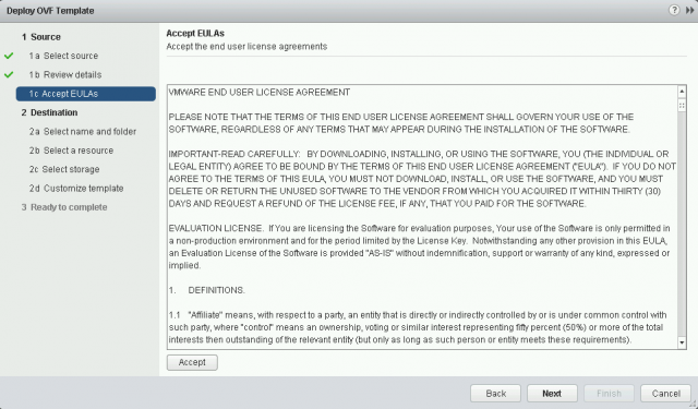 The next window will display the EULA. You must click Accept before clicking Next to proceed.