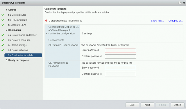 The Customize Template window is unique to this particular template. Depending on the virtual appliance being deployed, additional options may be requested. With this particular version of vShield Manager, a prompt will appear to configure the default CLI “admin” User Password and the defaultCLI Privilege Mode Password. If the passwords do not match, you will be prompted that the values are invalid.